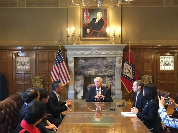 当地时间7月21日上午,中纺联副会长徐迎新、中国贸促会驻美国代表处总代表赵振格、江苏省纺织工业协会会长谢明、中纺联副秘书长袁红萍、江苏东渡纺织集团有限公司董事长徐卫民等中纺联代表团一行,应邀前往位于小石城的阿肯色州府大厦拜会州长韩旗胜(Asa Hutchinson)。