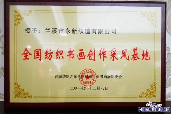 全国首家“全国纺织行业书画创作采风基地”落户浙江永新织造有限公司。继获“中国织造名城”、“中国纺织产业基地市”“棉纺织产业集群创新发展示范地区”等称号之后,兰溪再添一枚“国”字头金名片。